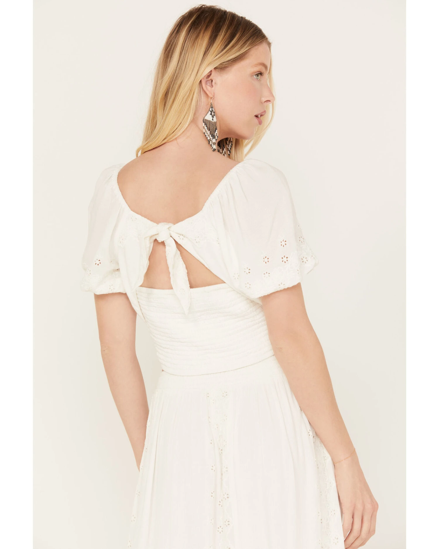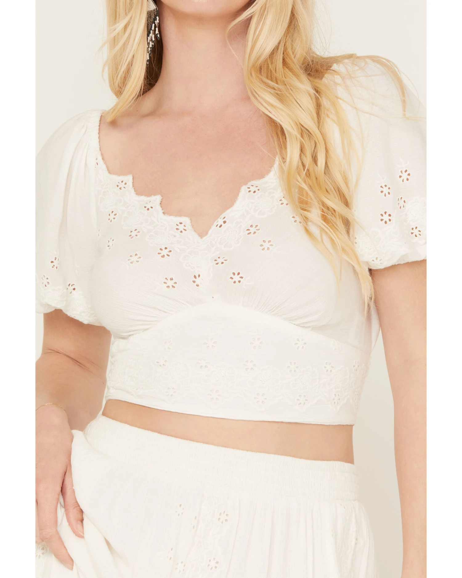 - Short sleeves with floral cut out accents